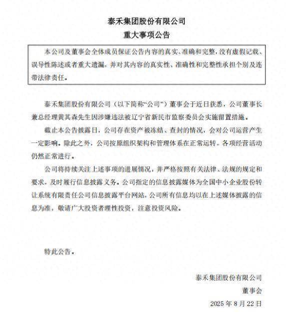 8月22日,泰禾集团股份有限公司公告,董事会于近日获悉,公司董事长兼总经理黄其森因涉嫌违法被辽宁省新民市监察委员会实施留置措施。截至本公告披露日,公司存在资产被冻结、查封的情况,会对公司运营产生一定影响。除此之外,公司按原组织架构和管理体系在正常运转,各项经营活动仍然正常进行。