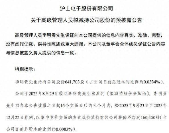 8月31日晚间,PCB行业龙头沪电股份(002463.SZ)公告称,公司高管李明贵计划自公告披露之日起15个交易日后的三个月内,暨2025年9月23日至2025年12月22日期间,以集中竞价交易方式减持不超过16万股公司股份,占公司目前总股本的比例不超过0.0083%。